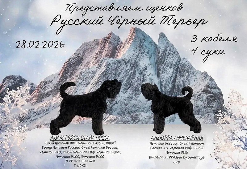 В большие зимние праздники в питомнике состоялась актировка бравых внуков Аполлона. Для продажи предлагаются щенки Русского черного терьера, одна девочка и один мальчик, крупные, костистые, красивые головы, породная нарядная шерсть, правильное телосложение, уверенный характер и позитивный темперамент. Только на территорию РФ, в ответственные руки с серьезными намерениями.